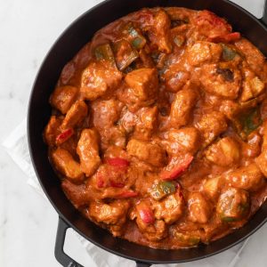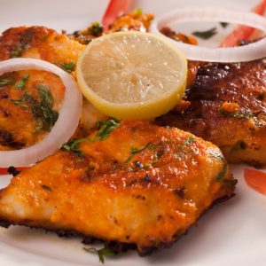 Muslos de pollo marinado en yogur, ajo, jengibre, limón y especias cocinados en horno especial (tandoori).